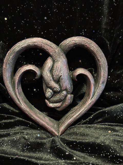 Väggdekoration i form av händer i ett hjärta. Gjord i flytspackel, målad med sockelfärg och färgvax. Tål inte att vara utomhus på vintern. 18 cm hög och 19 cm bred. Pris 200 kr. Kan beställas på hanti.se, klicka på bilden för att komma dit.