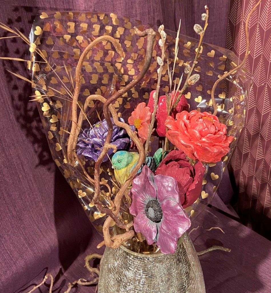 Färdiga buketter 1 Tulpan bukett gjutet i flytspackel, målat med sockelfärg och akrylfärg. Har skaft av bambu. Pris 480 kr SÅLD Kan beställas liknande. Blandbukett gjutet i flytspackel, målat med sockelfärg och akrylfärg. Skaft i bambu. Pris 480 kr.