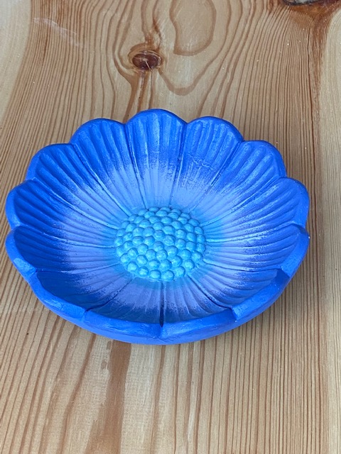 Skålar 6-1 Blomskål (20 cm i diameter), gjuten i flytspackel. Målad med sockel- och kalkfärg. Lackad med lack godkänt för livsmedel. Pris 280 kr