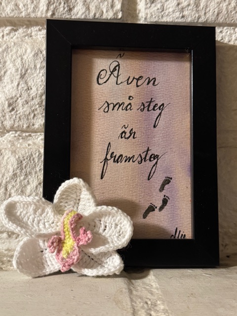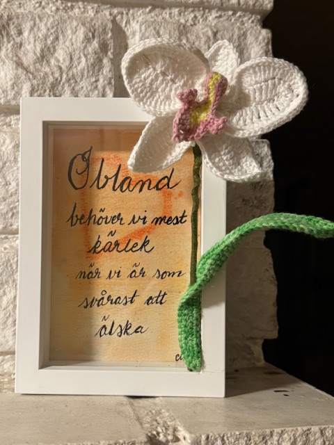 Tavlor T1 Tavla i akryl 30x40cm med hjärta i expanderbetong. 600 kr T2 Tavla i akryl 24x30cm med 2 malar i expanderbetong. 450 kr T3 Tavla i akryl 18x24cm med hjärtan och fjäril i expanderbetong. 350 kr T4 Tavla i akryl 12x18cm med hjärta i expanderbetong. 250 kr T5 Tavla i akryl 12x18cm med upphöjt mönster samt fjäril i expanderbetong. 250 kr T6 Tavla i akryl 12x18cm med mal i expanderbetong. 250 kr T7 Tavla i akryl 12x18cm med fjäril i expanderbetong. 250 kr T8 Tavla i akryl 12×18 cm med fjäril i expanderbetong. 250 kr T9 Tavla i akryl 24x30cm med hjärtan i expanderbetong. 450 kr Tavla i akvarell med virkad orkidé. 210 kr Finns att köpa här Tavla i akvarell med virkad orkidé. 210kr Finns att köpa här