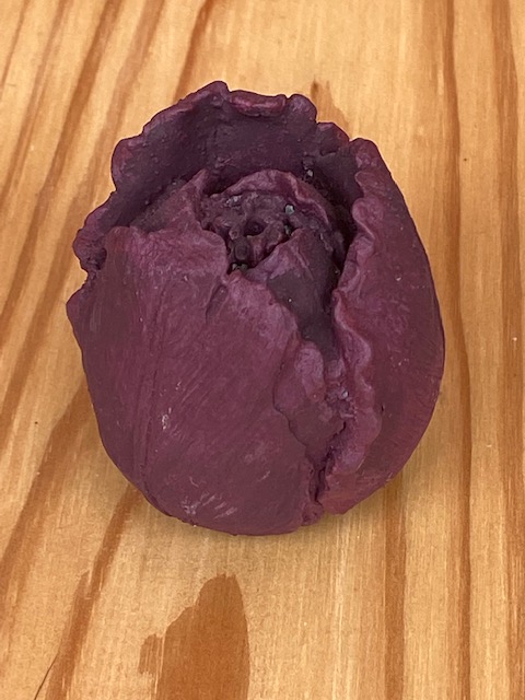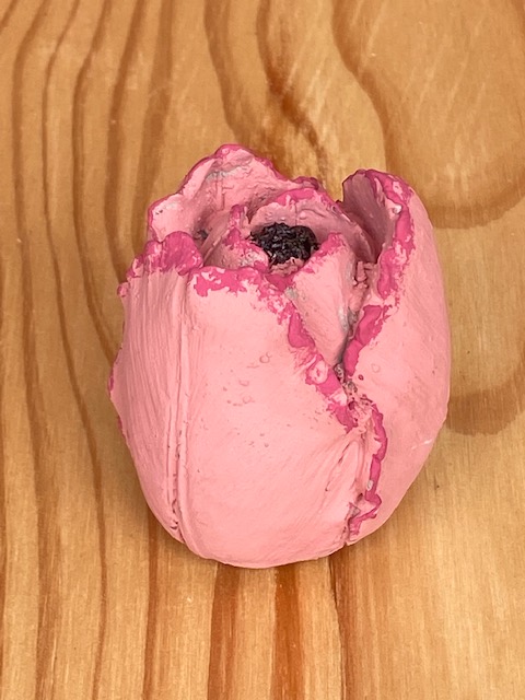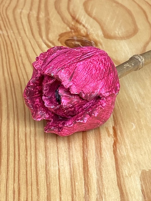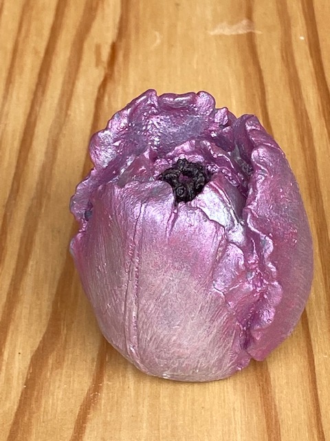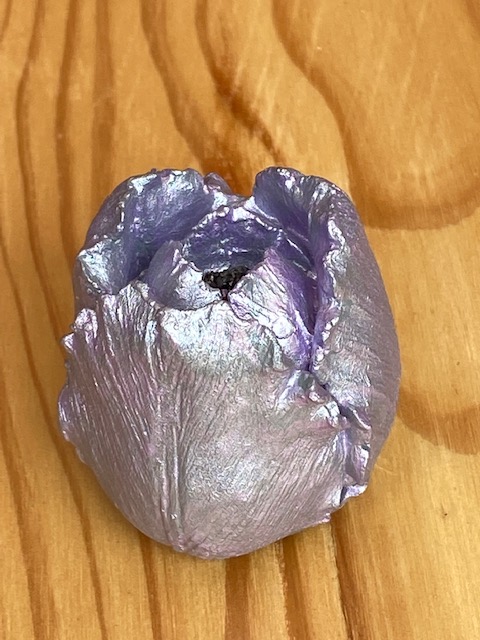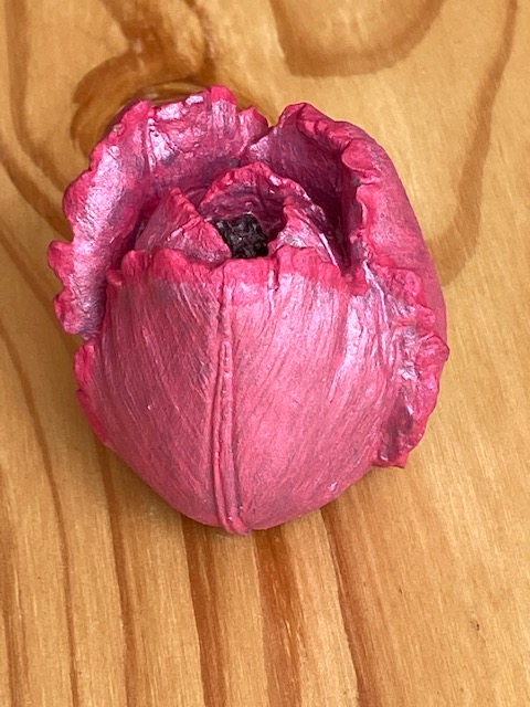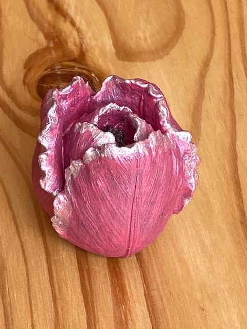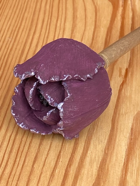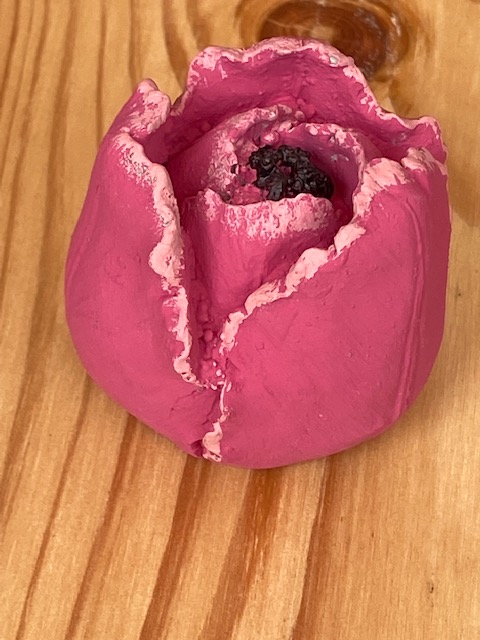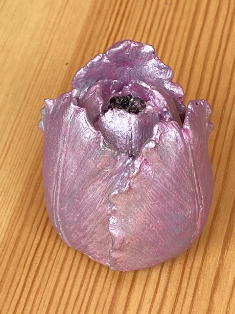SÅLD Tulpan (6 cm) gjuten i flytspackel, målad med sockel- och akrylfärg. Pris 70 kr, med stjälk i bambu 80 kr, med armeringsjärn från 90 kr.