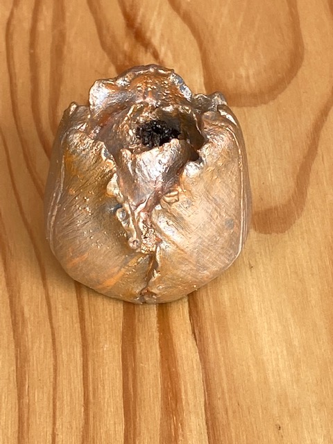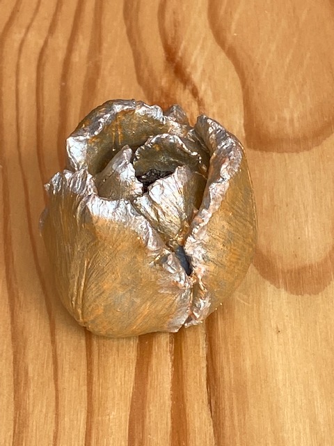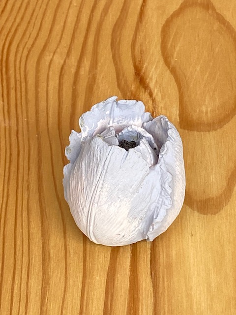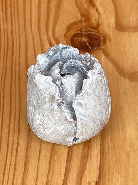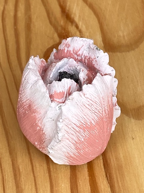 SÅLD Tulpan (6 cm) gjuten i flytspackel, målad med sockel- och kalkfärg. Pris 70 kr, med stjälk i bambu 80 kr, med armeringsjärn från 90 kr.